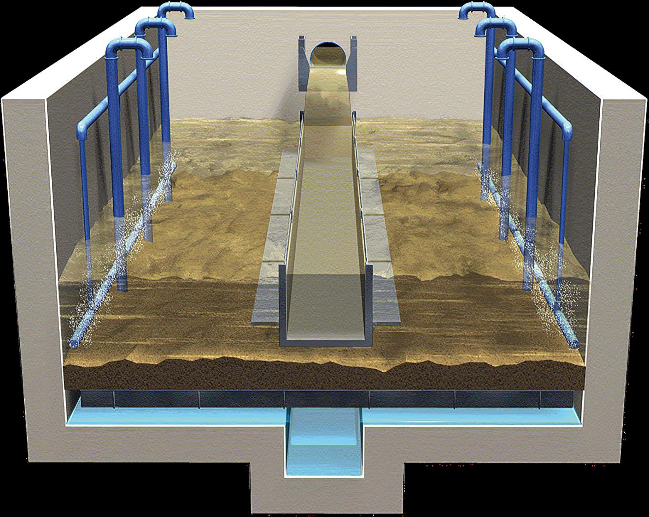 廢水通過進水渠上的配水堰進入過濾單元,并重力流至進水分配/反洗排水槽,再通過堰流到濾床上。防濺板有助于將水均勻分配至濾床上。通過這種串聯分流方式,溶解氧也被帶入到污水中。
