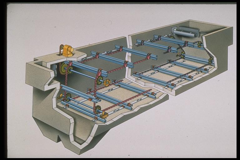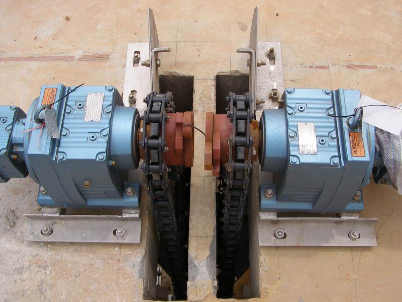 驅(qū)動(dòng)裝置的設(shè)計(jì)包括單臺(tái)電機(jī)服務(wù)單臺(tái)刮泥機(jī)或單臺(tái)電機(jī)服務(wù)兩臺(tái)刮泥機(jī)兩種形式。另外還可以采用單臺(tái)電機(jī)同時(shí)服務(wù)兩臺(tái)沉淀池刮泥機(jī)和一臺(tái)排泥渠刮泥機(jī)。驅(qū)動(dòng)鏈條有一次成形非金屬鏈條和不銹鋼鏈條兩種型號(hào)可供選擇。