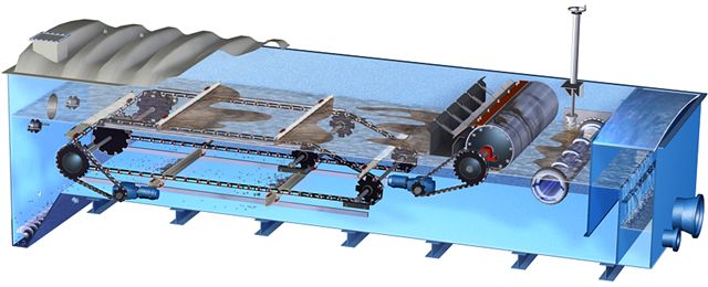 我們最普通的刮泥機設(shè)計是使用一個四軸的鏈條和刮板的收集裝置。在此布局中,刮板在鏈條的傳動下繞4組軸和鏈輪運轉(zhuǎn),有2組在近池頂,有2組在底部。刮板持續(xù)不斷的運轉(zhuǎn)把水面的浮油撇到分離器的出水端。當(dāng)刮板到達(dá)池體末端的時候,就會向底部運轉(zhuǎn),同時在此處把污泥送入池體進(jìn)水端的漏斗。